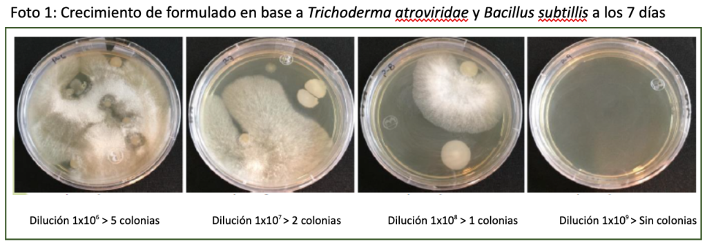 A partir de tres repeticiones por dilución, se observó un promedio de 1 colonia de hongos en 100 μL de la dilución 1 x 10-8. Esto equivale a un recuento de 1 x 109 UFC/g.