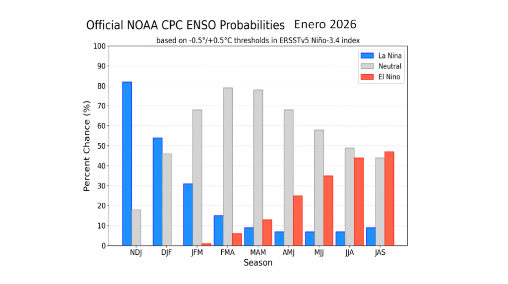 1.- Proyecciones, para enero de 2026, respecto a la evolución del evento frío La Niña.