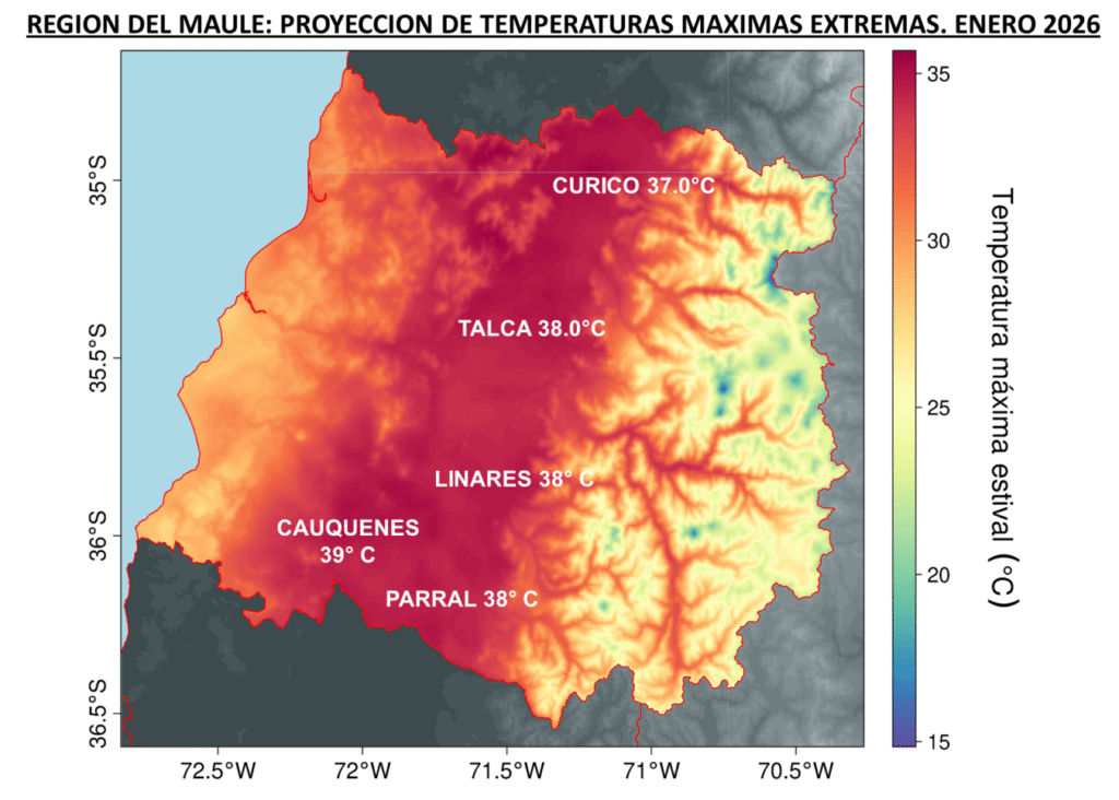 Figura 2. Proyección probabilística de temperaturas máximas extremas. Región del Maule, enero 2026.