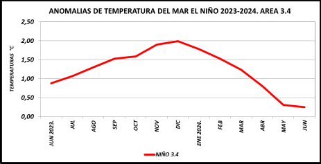 According to the data in the graph, corresponding to the sea surface temperature in the Niño 3.4 area, located in the central equatorial zone of the Pacific Ocean, the warm El Niño event indicates a continuous decrease in its temperatures starting in April 2024.