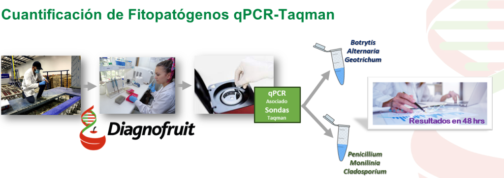 The qPCR is a variant of the PCR, which allows us to detect and quantify DNA, in this case of a target phytopathogen. For example, if I want to quantify Botrytis, it tells me how much DNA of this fungus there is in a sample, and according to a standardization that we carry out in the laboratory, we know that a quantity of DNA represents a number of conidia and that is the number that we deliver. At the same time, we have observed that there are critical population levels, but exceeding a certain threshold the probability of finding rot increases, so we build a basic diagnosis. But sometimes it is impossible to generate thresholds, or very difficult, for example, on surfaces of the packaging line, refrigerator, so what counts in that situation is the history, pre- and post-sanitization sampling, they tell us if this important management works or not.