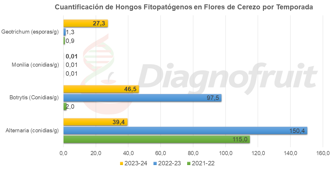 In summary, samples are taken in the field (flowers or fruits) or in packing (water or surface swabbing), and they are taken to the laboratory during the day. The samples are processed within 24 hours of their arrival, we extract DNA, and then we continue with the qPCR protocol, for which we have groups of pathogens for simultaneous analysis. Strictly speaking, two qPCR processes are carried out for each sample, and up to 3 species can be quantified in each tube; this simultaneity is achieved with the use of Taqman probes. The results are sent between 24 and 48 hours; and in cherries we have risk thresholds for the most important pathogens in water contamination and epiphytic populations in fruit. There are certain critical points to consider, for example, straw color is a good time to quantify epiphytic populations of fungi that cause rot.
