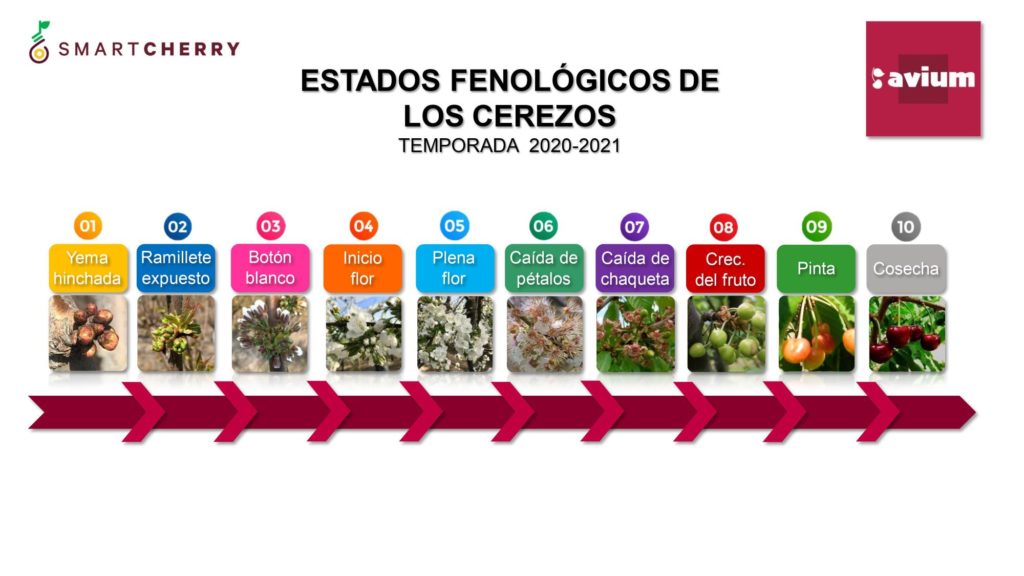 Learn about the phenological stages of cherry trees from swollen buds to harvest