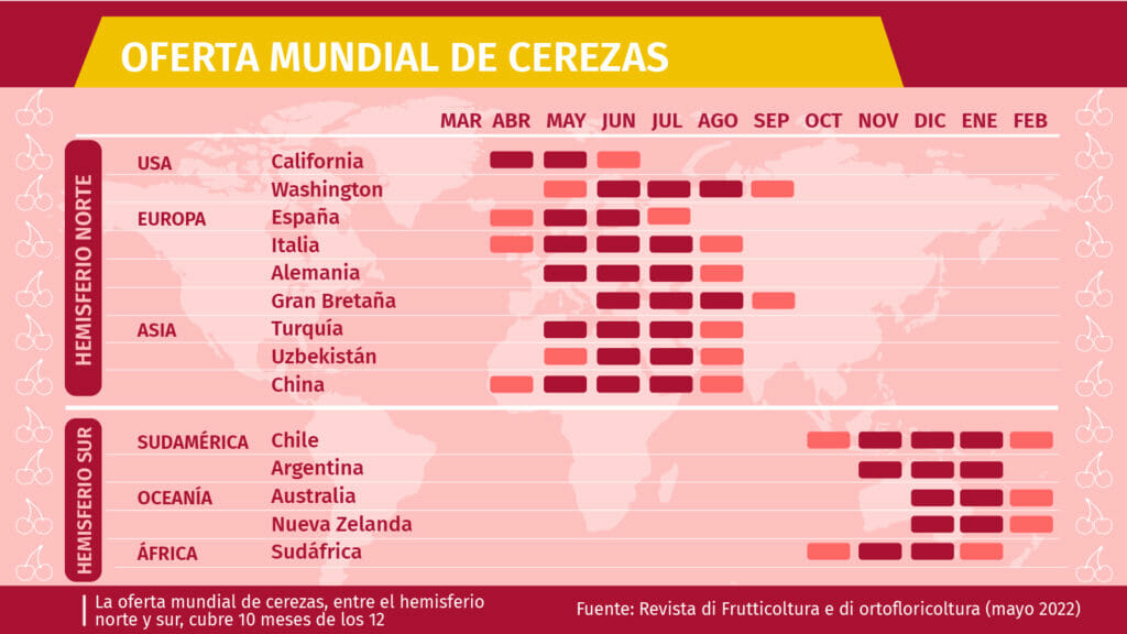 While Chile, the world's leading producer of cherries, produces this fruit between October, in earlier areas, and February, in later areas, in the United States, Europe and Asia, production is concentrated between April and September.