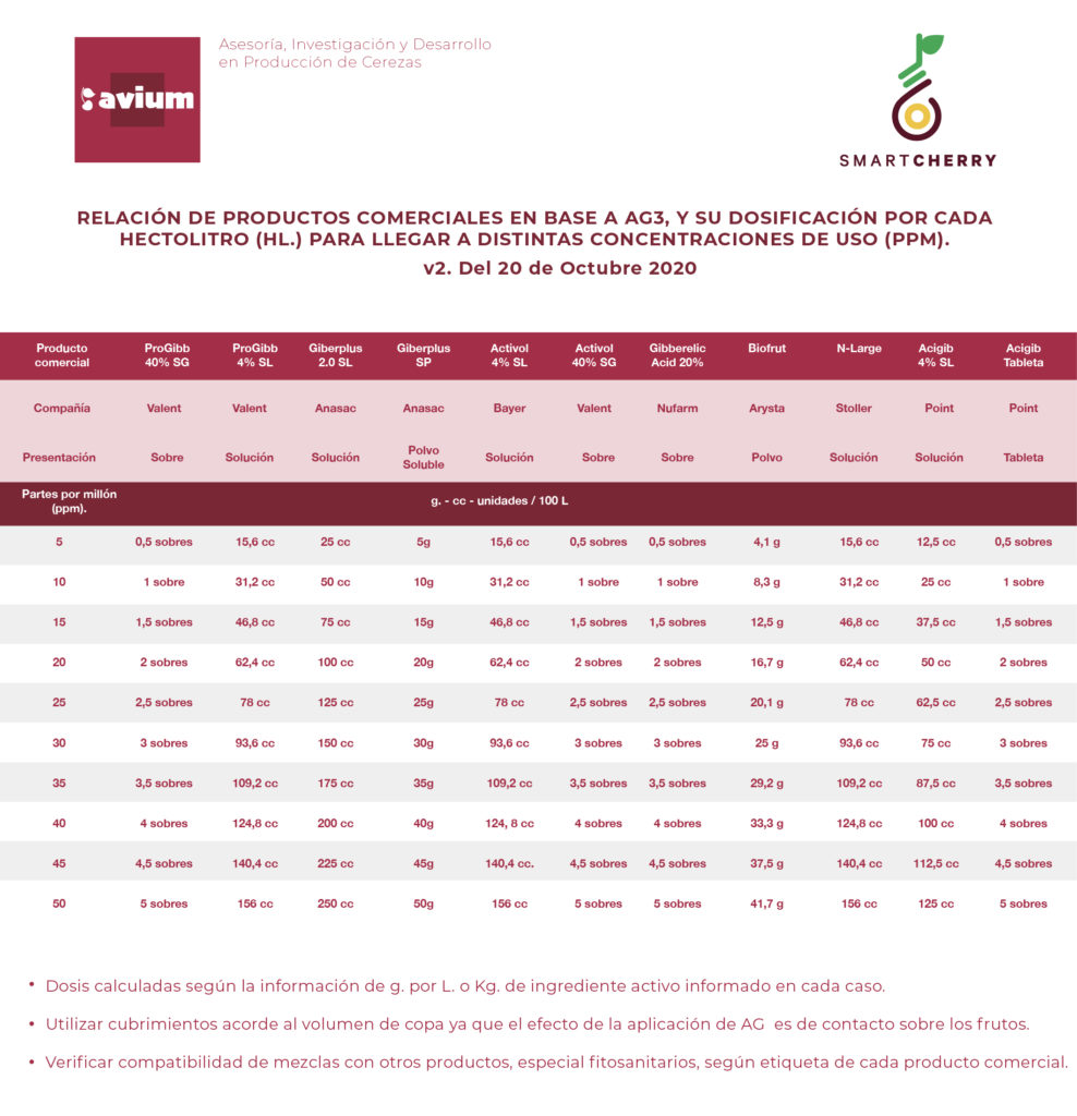 List of commercial products based on GA3 and their dosage to reach different concentrations of use