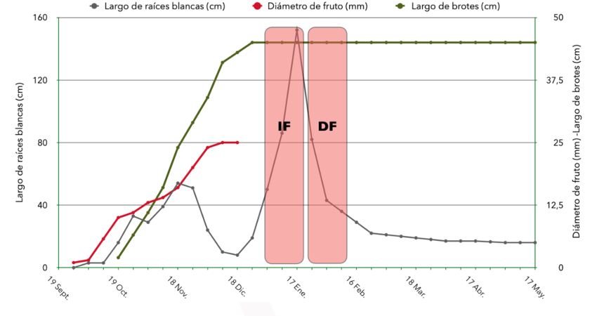 Figura 1. Dinámica del desarrollo de raíz, fruto y brote anual en cerezo adulto en Chile. Fuente: adaptado de Bonomelli et al. 2013.