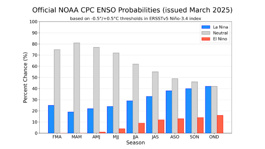 - Las barras azules del gráfico indican que el evento frío La Niña presenta una probabilidad menor al 25% de que continúe durante las estaciones otoño-invierno 2025. Por el contrario, una situación neutra (sin la presencia del evento cálido El Niño o frío La Niña) supera el 75% de probabilidades, que se mantenga por lo menos hasta julio del presente año.