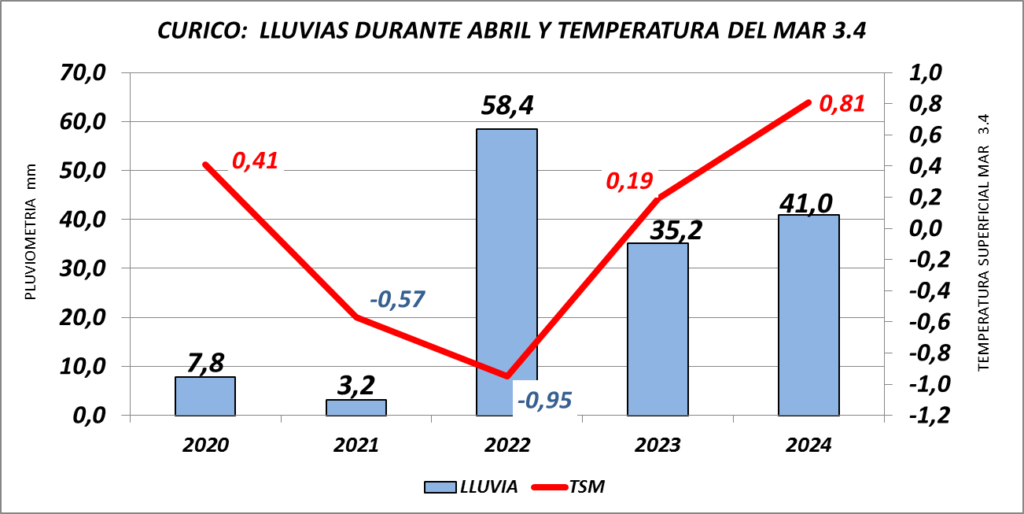 El gráfico indica la relación que ha existido, en los últimos 5 años, entre la temperatura superficial del mar (TSM), asociado al área de ocurrencia de los eventos El Niño y La Niña (que lleva el número 3.4) y las lluvias durante abril en Curicó.
