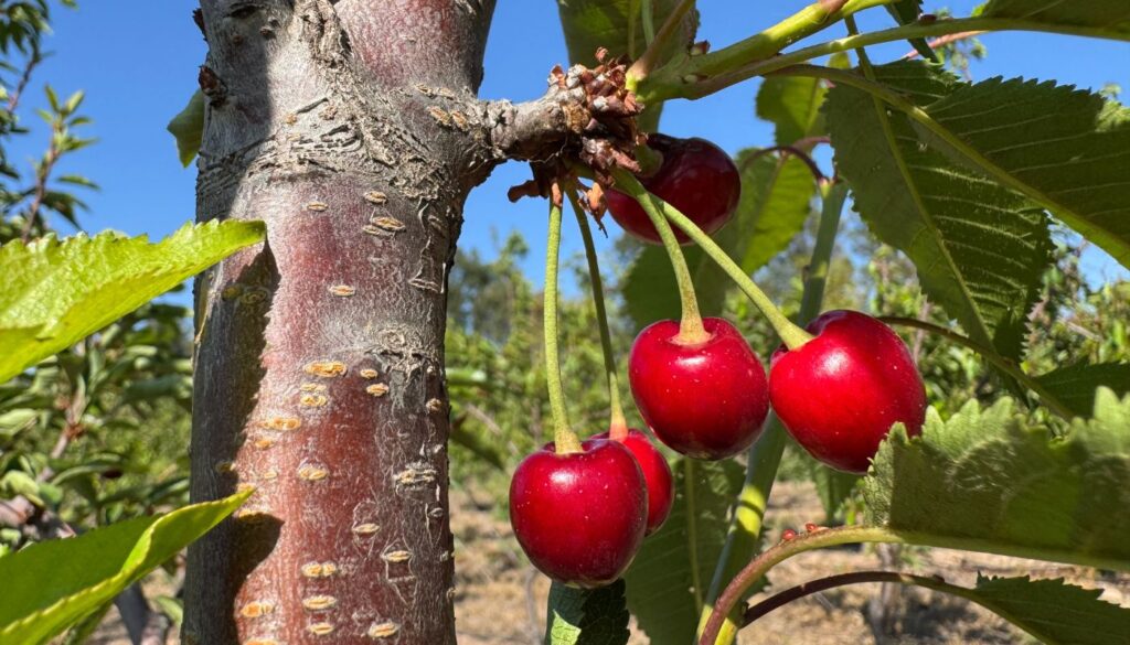 Bing variety cherry orchard on Maxma 14 located in the Santa Sofia agricultural area (Santa Cruz, O'Higgins region). Due to the high vigor and associated cost, it was decided to carry out summer pruning in a mechanized manner, and as a subsequent treatment for wound protection and disease prevention, BACTOFUS®️ + PH4®️ was applied at doses of 2.5 and 0.5 liters per hectare, respectively. The excellent sanitary condition of the orchard can be appreciated in the images.