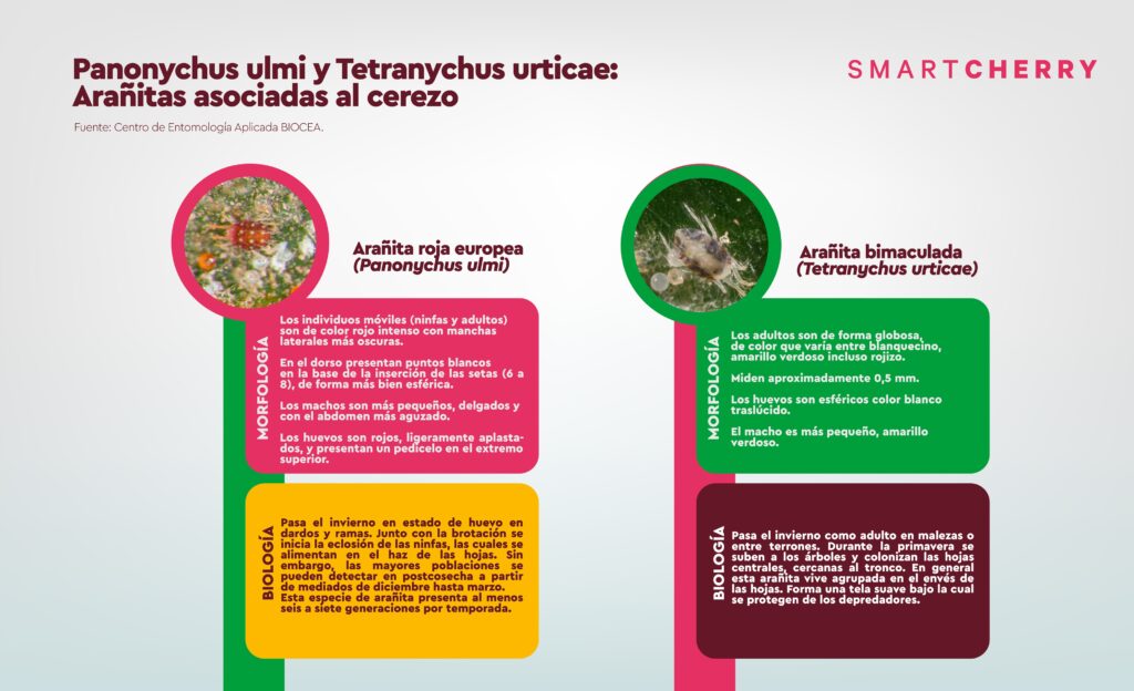 La arañita roja europea, también conocida como Panonychus ulmi, y la arañita bimaculada, también denominada Tetranychus urticae, son dos especies de ácaros fitófagos asociados a varios cultivos y especies vegetales, entre ellos el cerezo.
