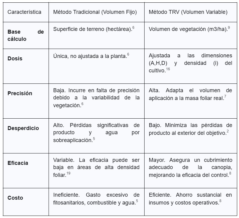 Este método, al integrar el volumen tridimensional del cultivo con su densidad de follaje, permite una dosificación mucho más precisa que el enfoque tradicional de volumen fijo, ya que la cantidad de caldo se adapta directamente a la masa foliar que realmente necesita ser tratada.8