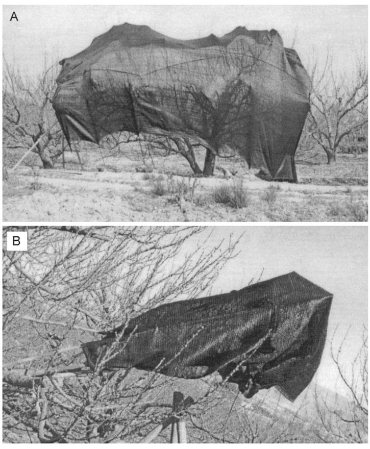 El uso de malla sombra en huertos de cerezos orientados a cosechas tempranas busca reducir la radiación solar para crear un ambiente de día corto, y entrar y mejorar la calidad en la etapa de receso. Esta técnica estudiada, entre otros, por Ruiz et al (2005), donde sombrearon árboles de damasco completos y partes de estos (Imagen 1), demostraron una disminución significativa en la intensidad de la radiación solar en las ramas sombreadas, lo que a su vez reduce la temperatura en las estructuras del árbol. También observaron mayor incidencia de radiación solar en los árboles no sombreados y que la temperatura era mayor, mientras que la malla sombra redujo la intercepción y la radiación solar, disminuyendo la temperatura en 6°C. Estos hallazgos resaltan el potencial de la malla sombra para influir en la brotación y la producción de los cerezos, especialmente en condiciones de radiación solar elevada.