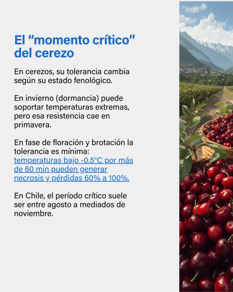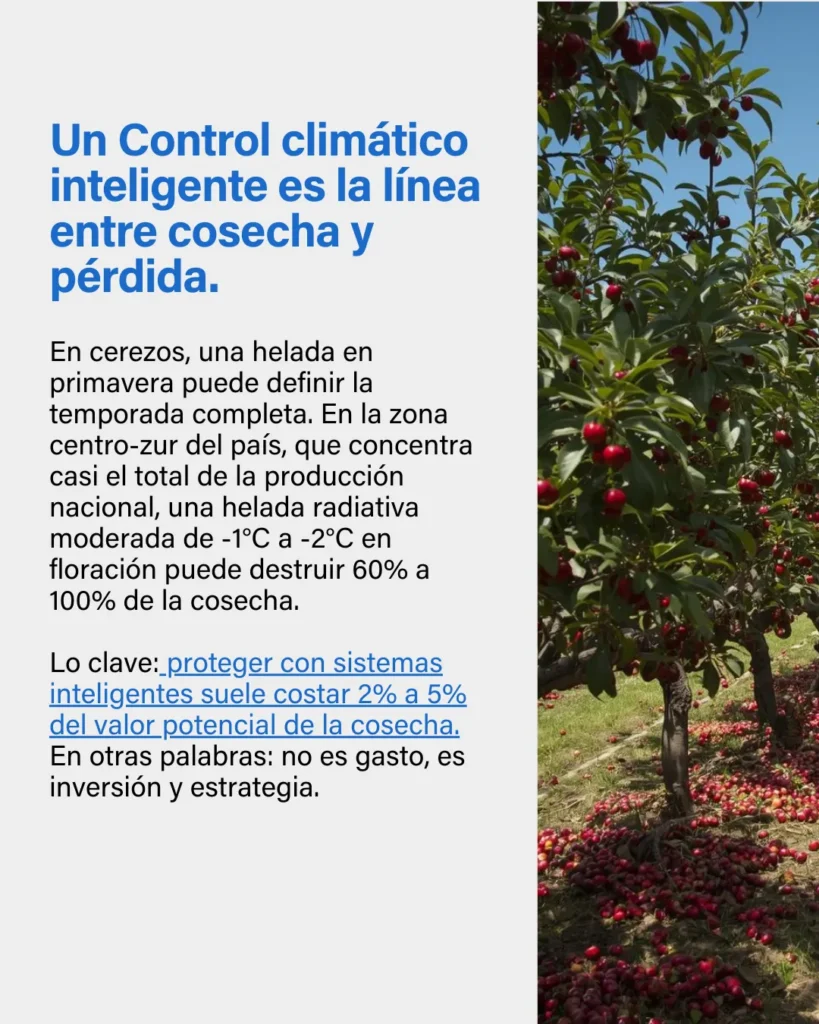 En cerezos, una helada en primavera puede definir la temporada completa. En la zona centro-zur del país, que concentra casi el total de la producción nacional, una helada radiativa moderada de -1°C a -2°C en floración puede destruir 60% a 100% de la cosecha.