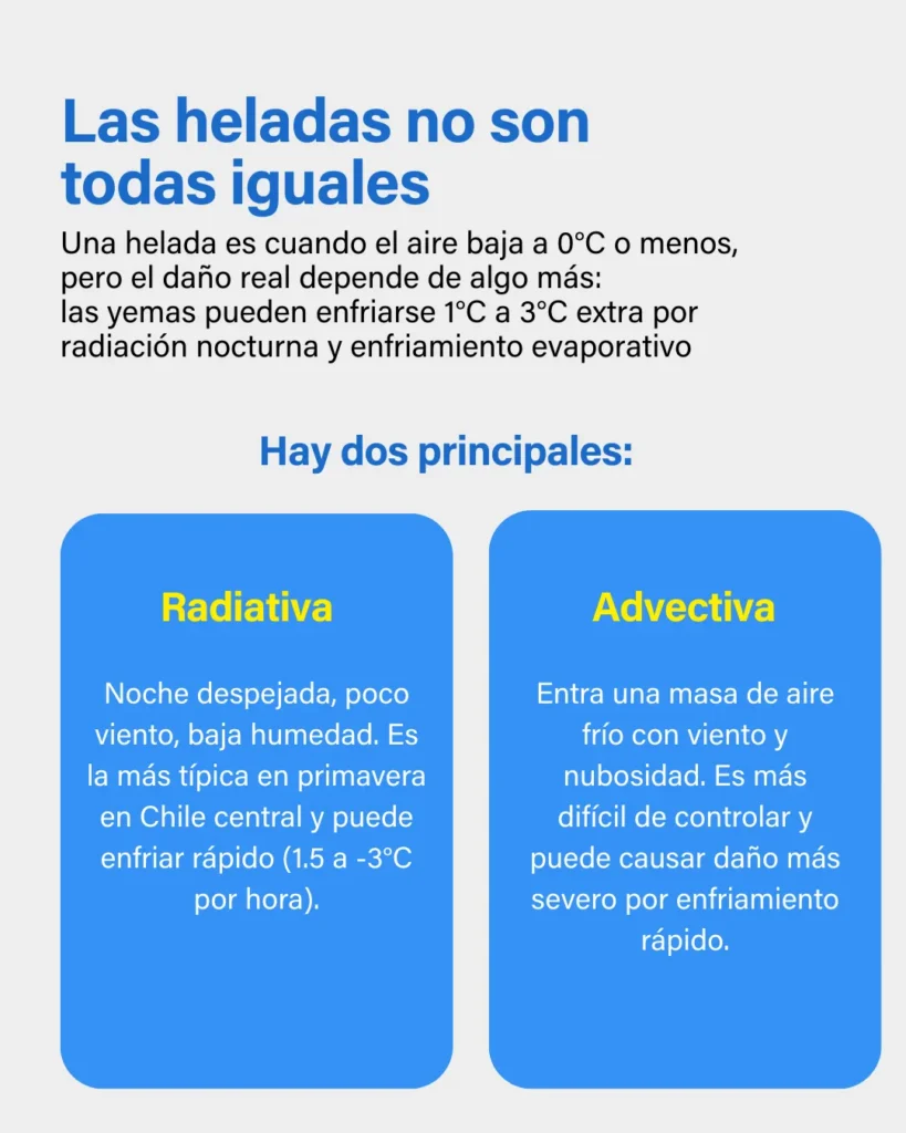 •⁠ ⁠Radiativa: noche despejada, poco viento, baja humedad. Es la más típica en primavera en Chile central y puede enfriar rápido (1.5 a -3°C por hora).
