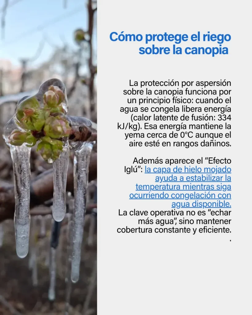 La protección por aspersión sobre la canopia funciona por un principio físico: cuando el agua se congela libera energía (calor latente de fusión: 334 kJ/kg). Esa energía mantiene la yema cerca de 0°C aunque el aire esté en rangos dañinos.
