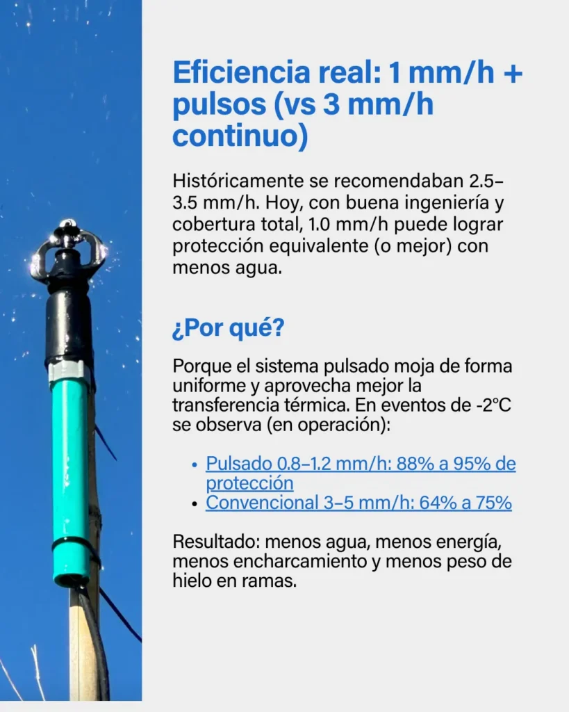 ¿Por qué? Porque el sistema pulsado moja de forma uniforme y aprovecha mejor la transferencia térmica. En eventos de -2°C se observa (en operación):