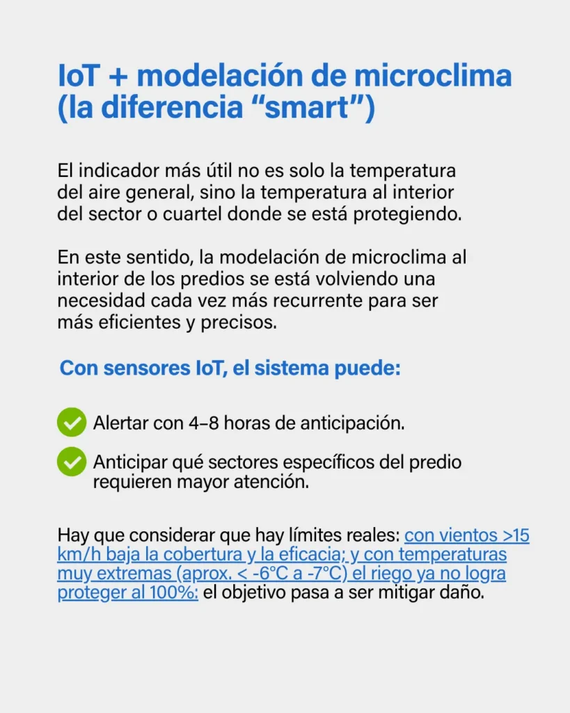 Hay que considerar que hay límites reales: con vientos >15 km/h baja la cobertura y la eficacia; y con temperaturas muy extremas (aprox. < -6°C a -7°C) el riego ya no logra proteger al 100%: el objetivo pasa a ser mitigar daño.