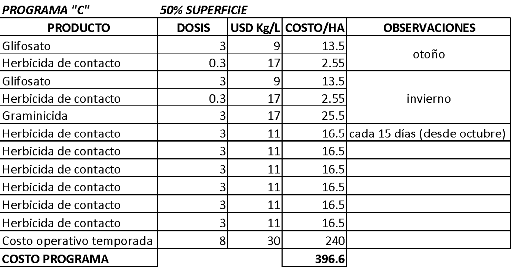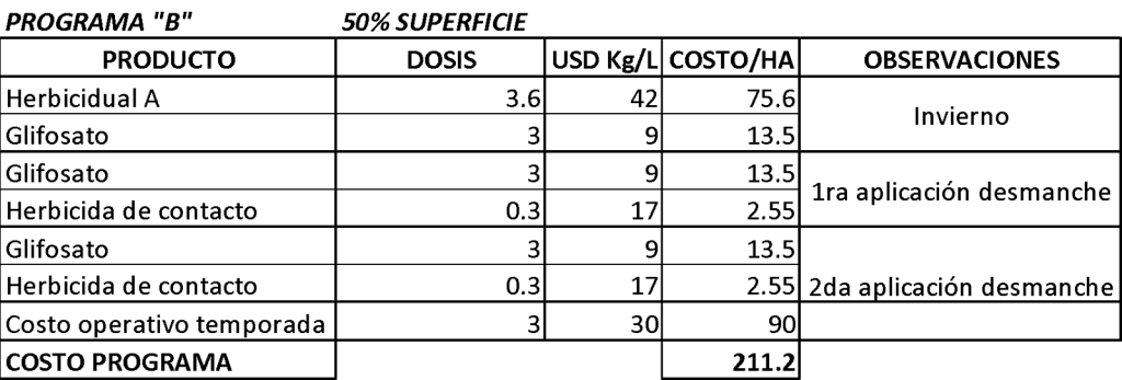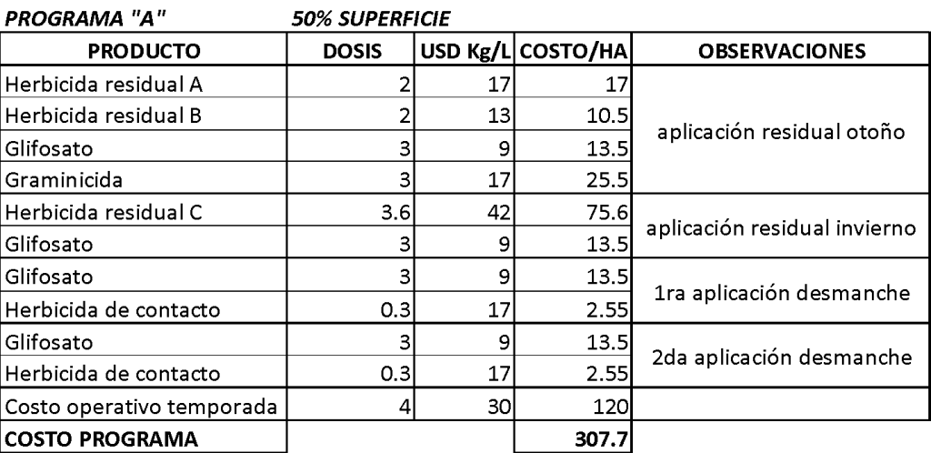 A continuación, un análisis de costo de distintos programas “tipo” en el control de malezas. El programa A considera el uso de 2 aplicaciones de herbicidas residuales en otoño e invierno, además de 2 desmanches de malezas perennes en primavera-verano, este programa se define bajo una presión normal de malezas en el huerto. El programa B, considera el uso de 1 herbicida residual a salida de invierno y 2 desmanches de malezas perennes en primavera-verano, este programa se establece para un huerto limpio con una estrategia de más de una temporada de uso de residuales como estrategia de control de malezas. El programa C, considera sólo estrategia de post emergencia durante todo el año, buscando controlar un amplio espectro de malezas.