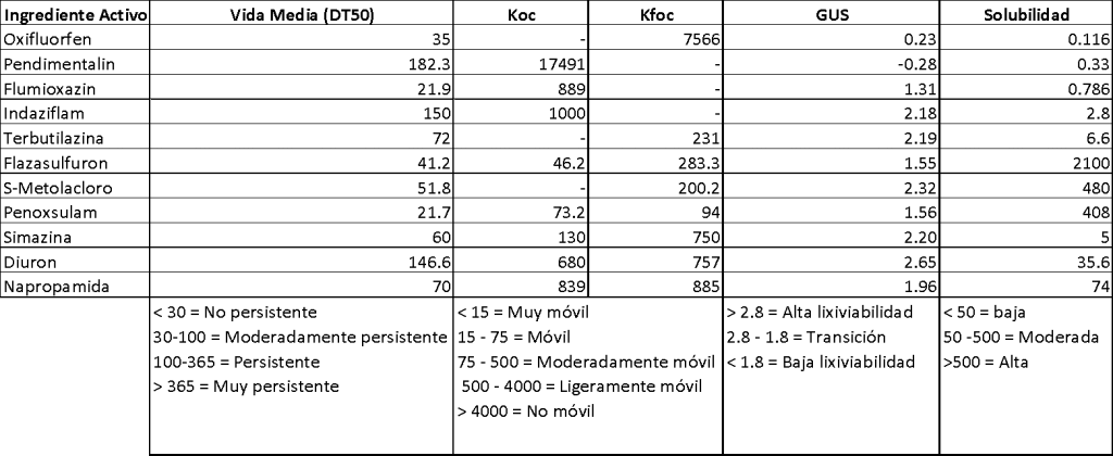 A continuación un cuadro informativo con los principales herbicidas suelo activos disponibles en el mercado y sus valores de DT50, Koc, Kfoc, GUS y Solubilidad: