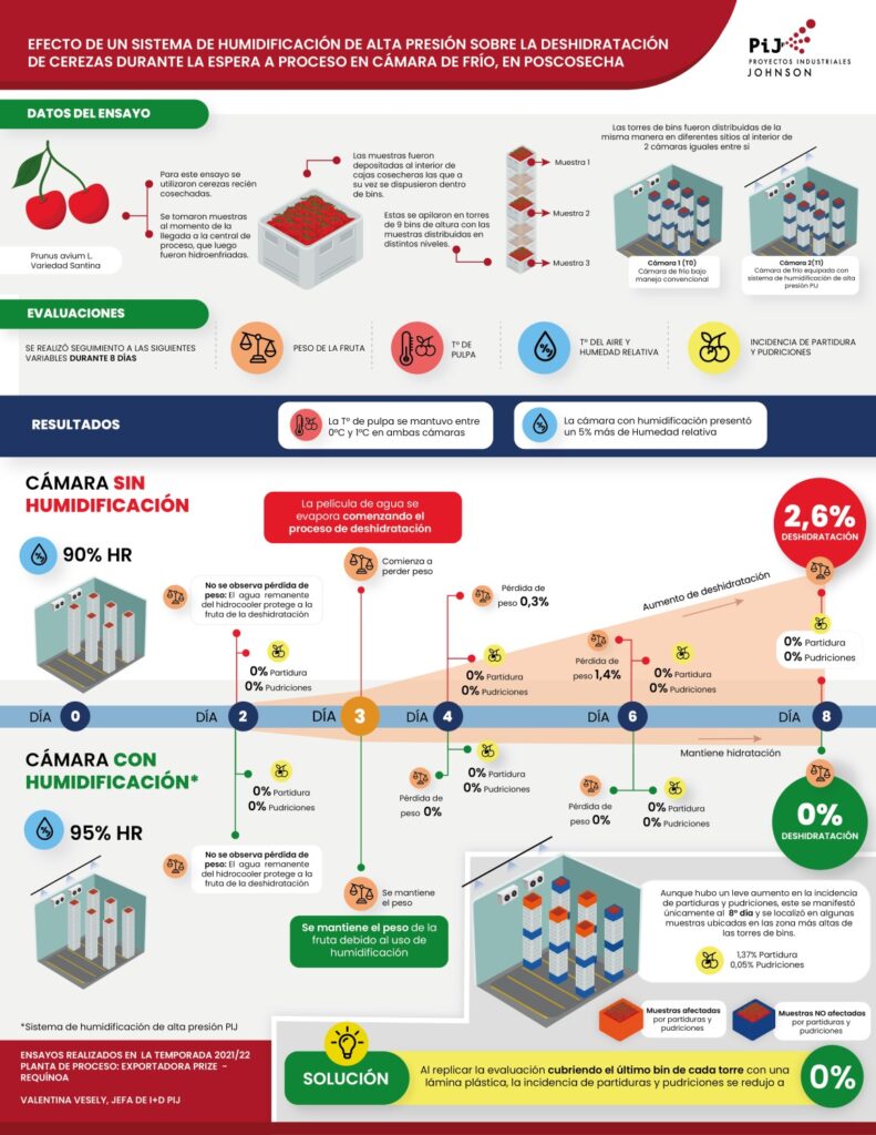 La infografía de lo que habla es de un ensayo que se realizó en dos cámaras de frío «hermanas», una con y una sin humidificación. En estas lo que se buscaba era comprobar cual era el efecto de la humidificación en la fruta almacenada durante más de 3 días. Lo que se comprobó es que la fruta a partir del 3er día sin humidificación comenzaba a deshidratarse hasta llegar a un 2,6% en 8 días.