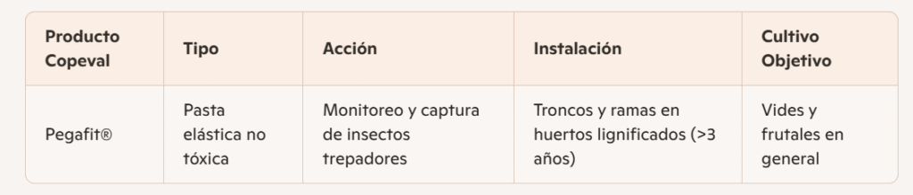 | Pegafit® | Pasta elástica no tóxica | Monitoreo y captura de insectos trepadores | Troncos y ramas en huertos lignificados (>3 años) | Vides y frutales en general |