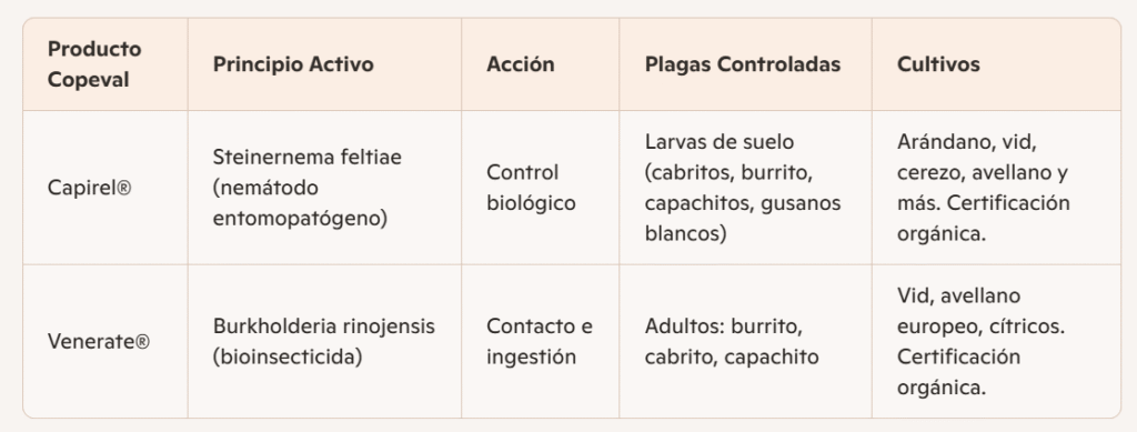 | Capirel® | Steinernema feltiae (nemátodo entomopatógeno) | Control biológico | Larvas de suelo (cabritos, burrito, capachitos, gusanos blancos) | Arándano, vid, cerezo, avellano y más. Certificación orgánica. |