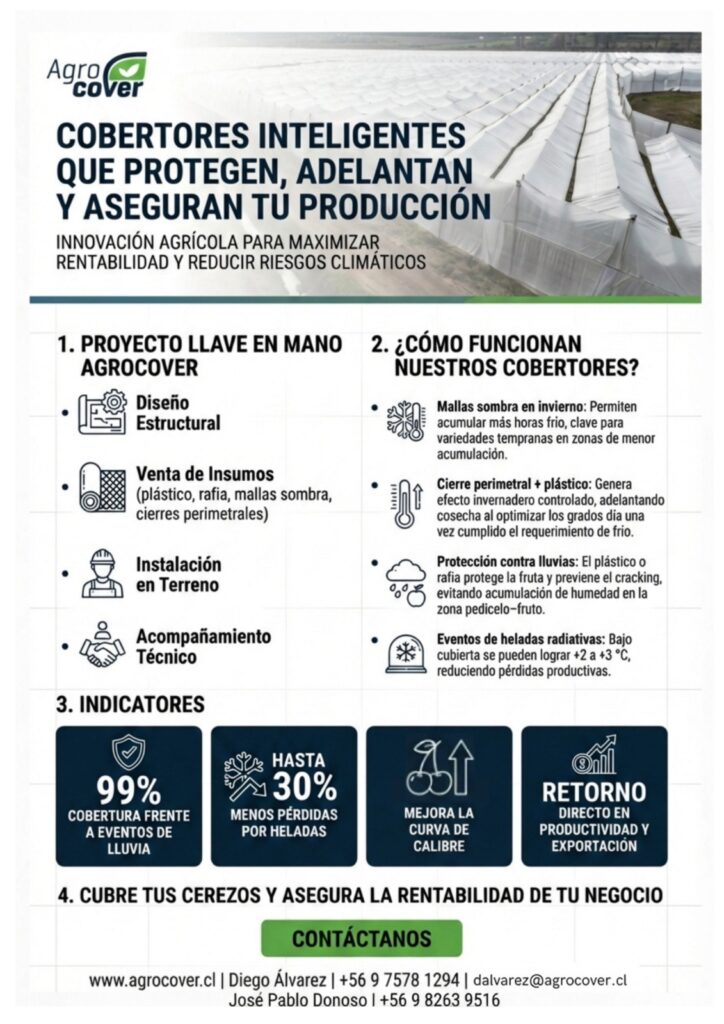 Con cobertores bien instalados que alcanzan hasta 99% de protección frente a lluvias y reducen pérdidas por heladas radiativas, tu producción deja de depender únicamente del clima y comienza a depender de tu estrategia.